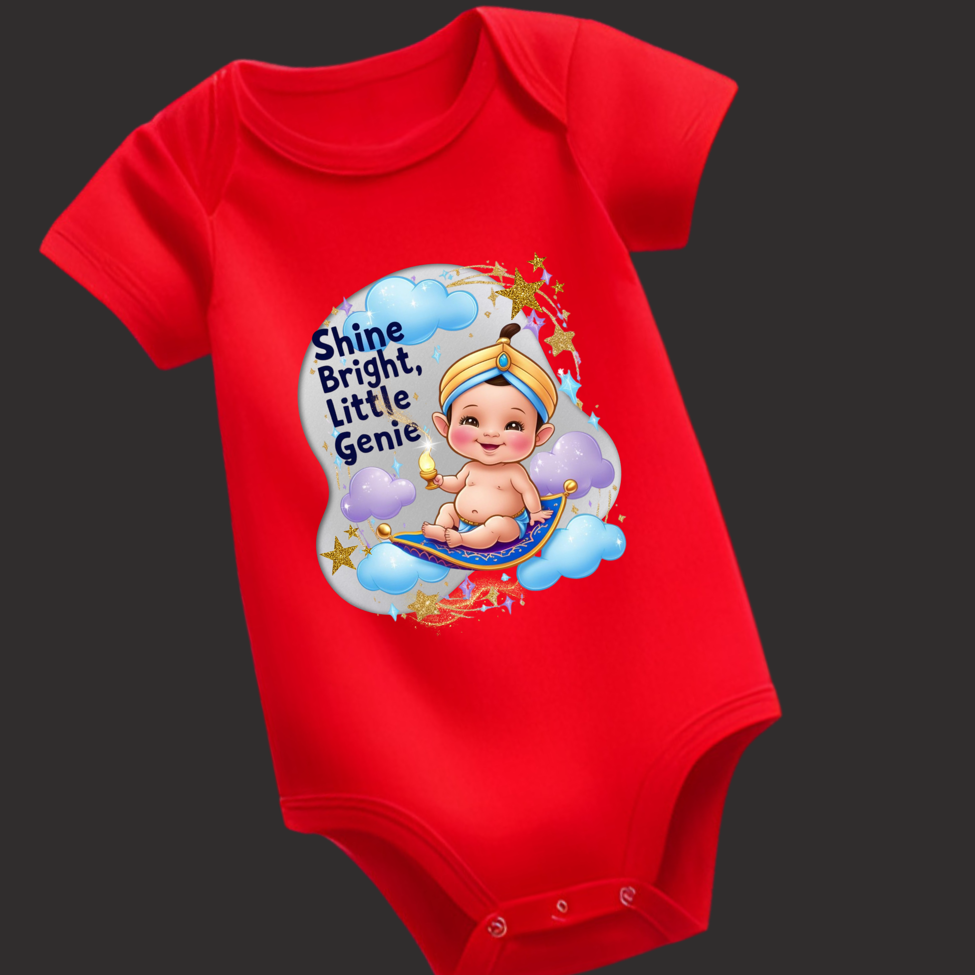 Unleash a world of wonder with our “Shine Bright, Little Genie” romper – featuring a charming baby genie flying high on a magic carpet, holding his glowing lamp. This whimsical design sparks imagination and makes every moment magical. Made with love and ultra-soft fabric, it’s perfect for cuddles, playtime, and dreamy adventures.