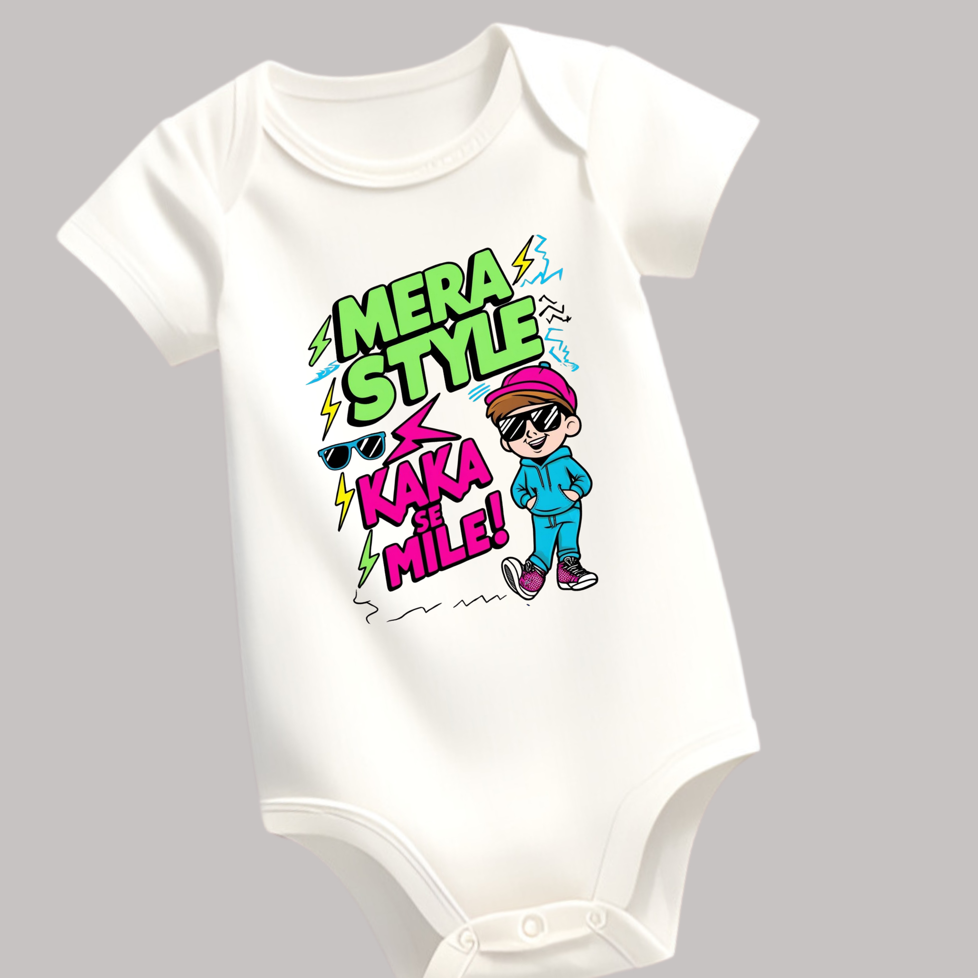 Dress your munchkin in pure cuteness with our Mera Style Kaka Se Mile Romper! Part of the Funky Family Collection by Digital Storyteller India, it brings fun, comfort, and a dash of swag. Perfect for family gatherings and everyday play.