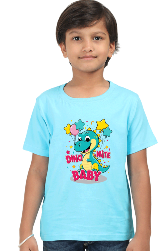 Dress your baby in this adorable 'Dino-Mite Baby' T-shirt , perfect for toddlers who love dinosaurs. Made with 100% premium soft cotton, this outfit ensures all-day comfort for your little bundle of joy. The playful cartoon dinosaur design, paired with vibrant colors, makes it a fun and eye-catching choice for playdates, parties, or just lounging around.