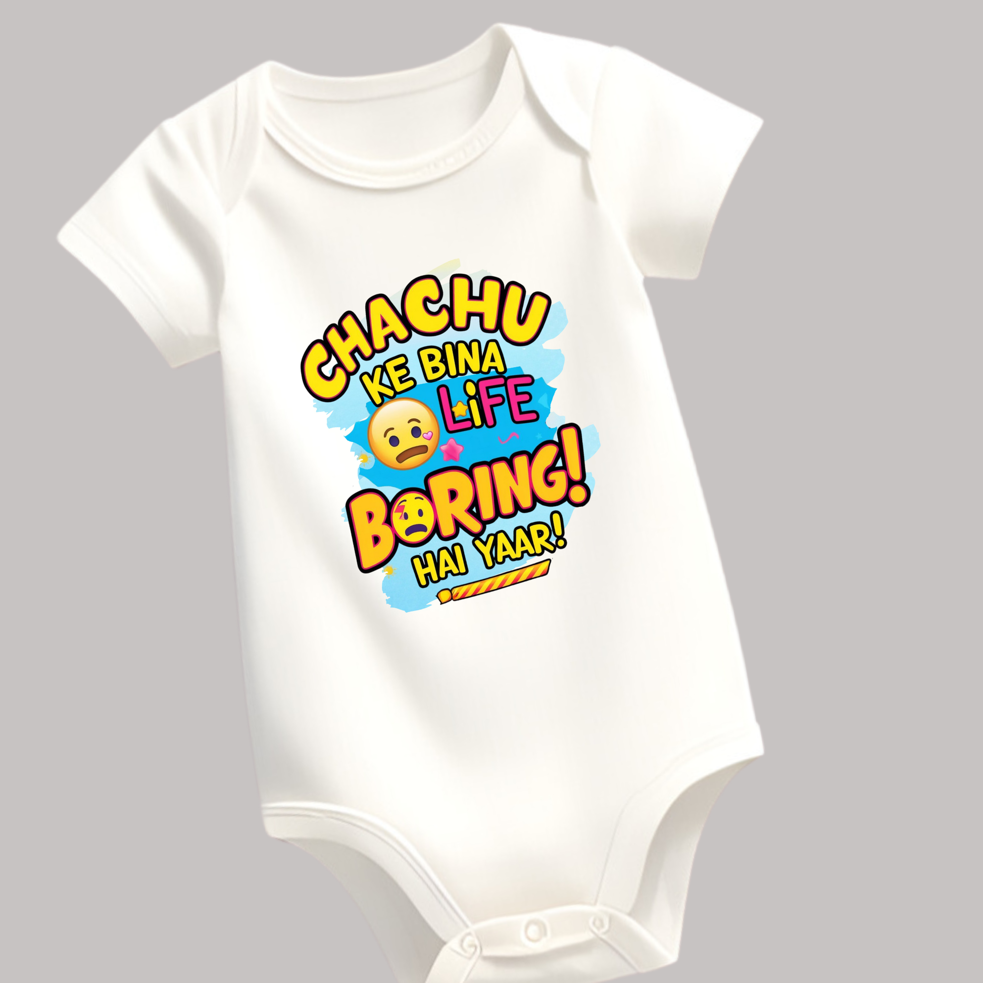 This adorable “Chachu ke bina life boring hai yaar!” romper adds a fun twist to babywear and celebrates the cutest bond ever — Baby + Chachu 💛