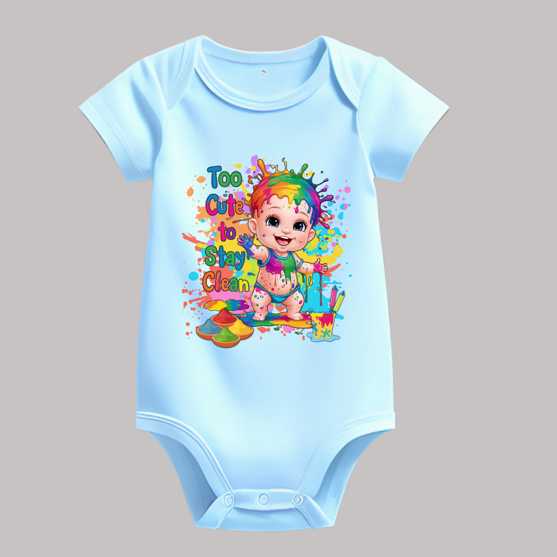 Get your little one Holi-ready with our festive kids' rompers and t-shirts, featuring the vibrant text "To Cute to Stay Clean"—a fun and playful way to celebrate the festival of colors!