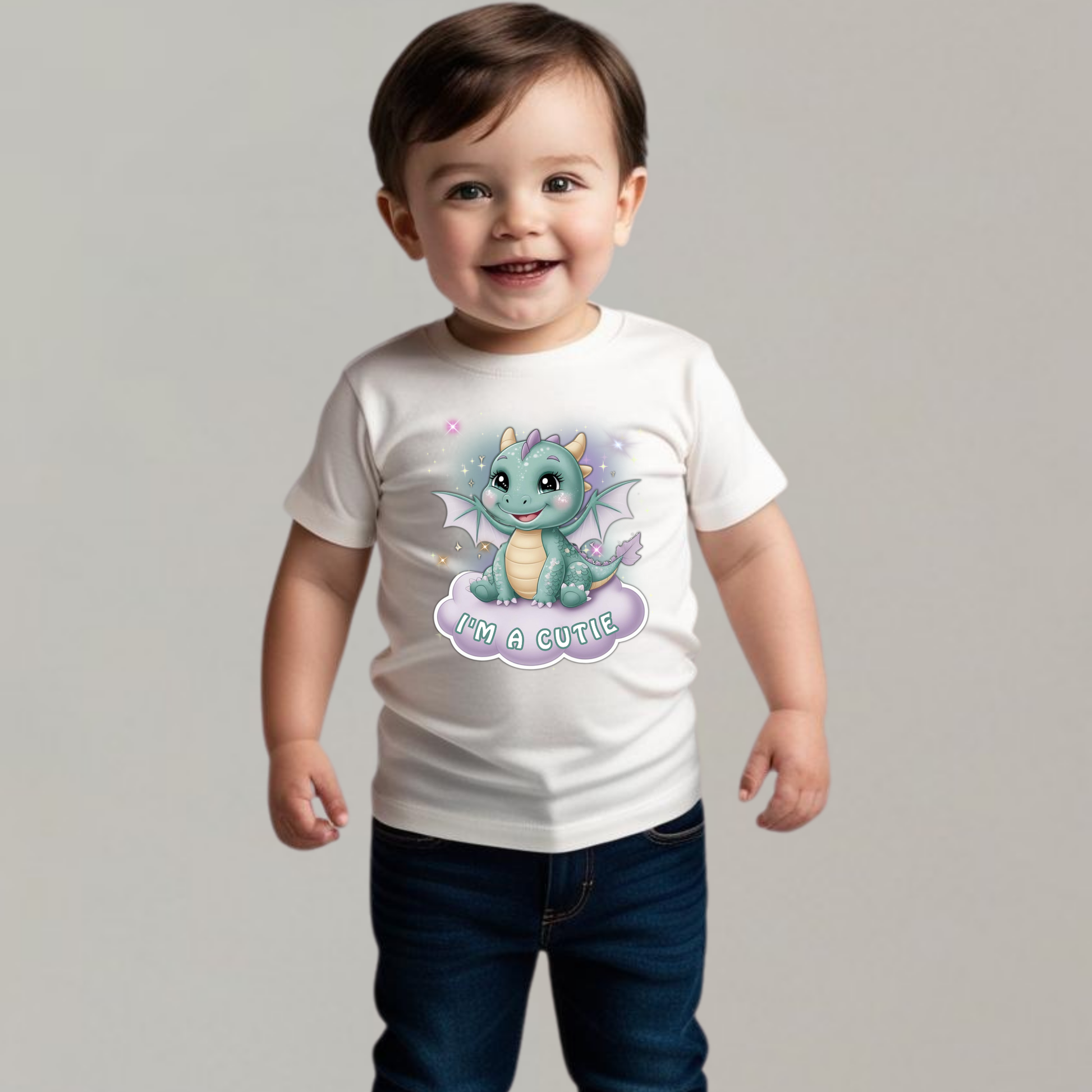 Design: Baby dragon in an irresistibly cute pose with the words "I'm a Cutie". Perfect for showcasing your little one’s bubbly personality.
