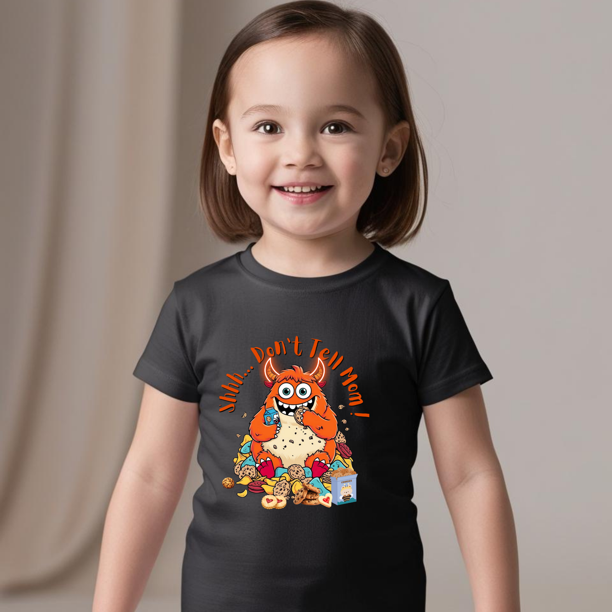 A playful design that’s as cheeky as your little one! Featuring a cookie-munching monster and the phrase "Shhh... Don’t Tell Mom", this tee is perfect for those who love fun, laughter, and a little bit of mischief.